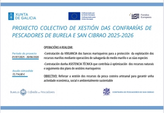 A CONFRARIA DE PESCADORES DE BURELA, coa CONFRARIA DE PESCADORES DE SAN CIBRAO como beneficiario 2, ten concedida unha axuda da CONSELLERIA DO MAR da XUNTA DE GALICIA e do Fondo Europeo Maritimo de Pesca e de Acuicultura (FEMPA) da UE por un importe total de 72.714,00E, correspondendo o 100% á Confraría de Pescadores de Burela.