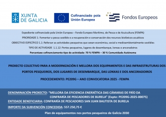 A CONFRARIA DE PESCADORES DE BURELA ten concedida unha subvencion para o proxecto de aforro enerxetico nas instalacions de frio existentes xestionada pola entidade e sistemas auxiliares necesarios para o seu funcionamento, por un total de 557.250,75E, concedidos ao 100%, dos cales están subvencionados polo FEMPA (70%): 390.075,53 E, e pola C.A. (30%): 167.175,22E.